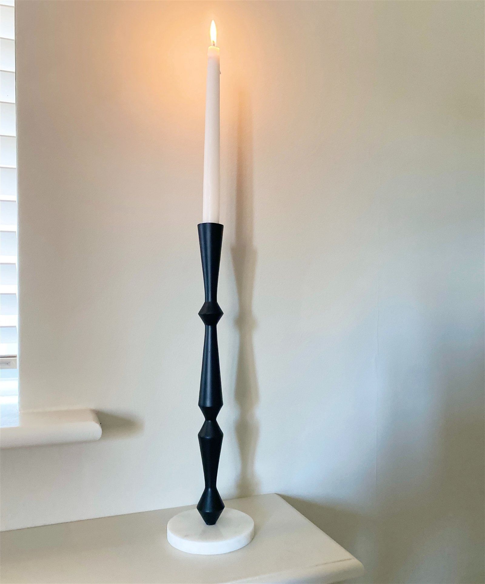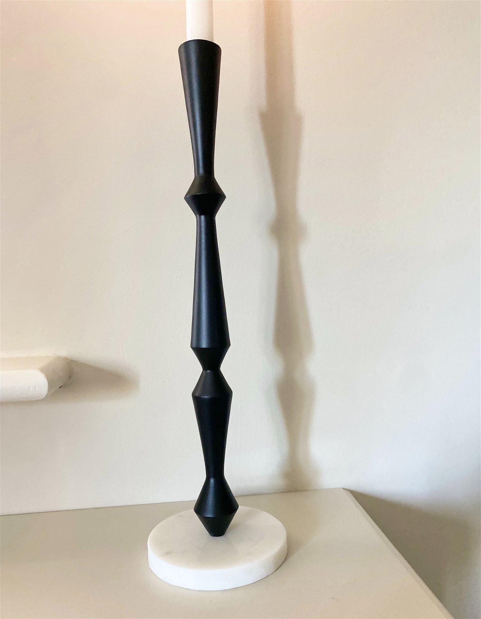 A single art deco style candle stick holder, featuring a round marble base. The stem is matt black and made from Aluminium, with a white and grey marble base. This candle stick holder can hold one taper candle. Measurements: D10.5 x H38.5 x W10.5cm