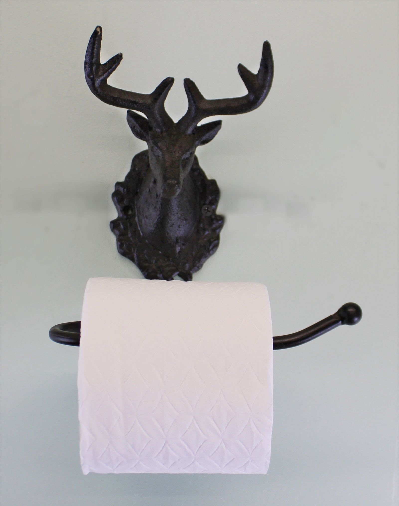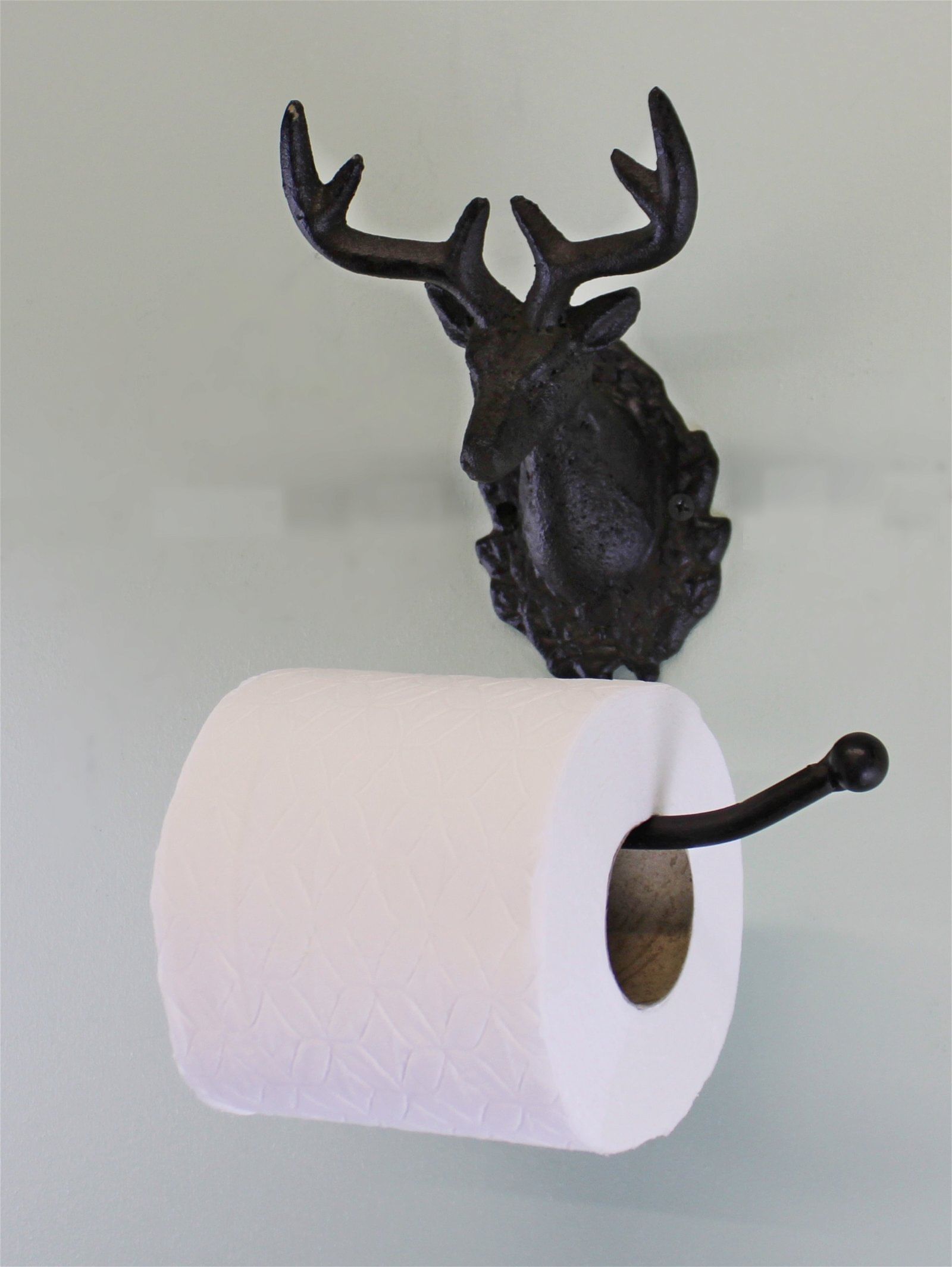 Wall mounted Rustic Toilet Roll Holder Add a bit of character to your bathroom or shower room with this quirky, rustic industrial toilet roll holder with a stag head design. Made from metal, this is wall mountable with pre-drilled holes. Made of cast iron with an aged finish to add character to any bathroom area. Measurements: 11 x 19 x 19cm