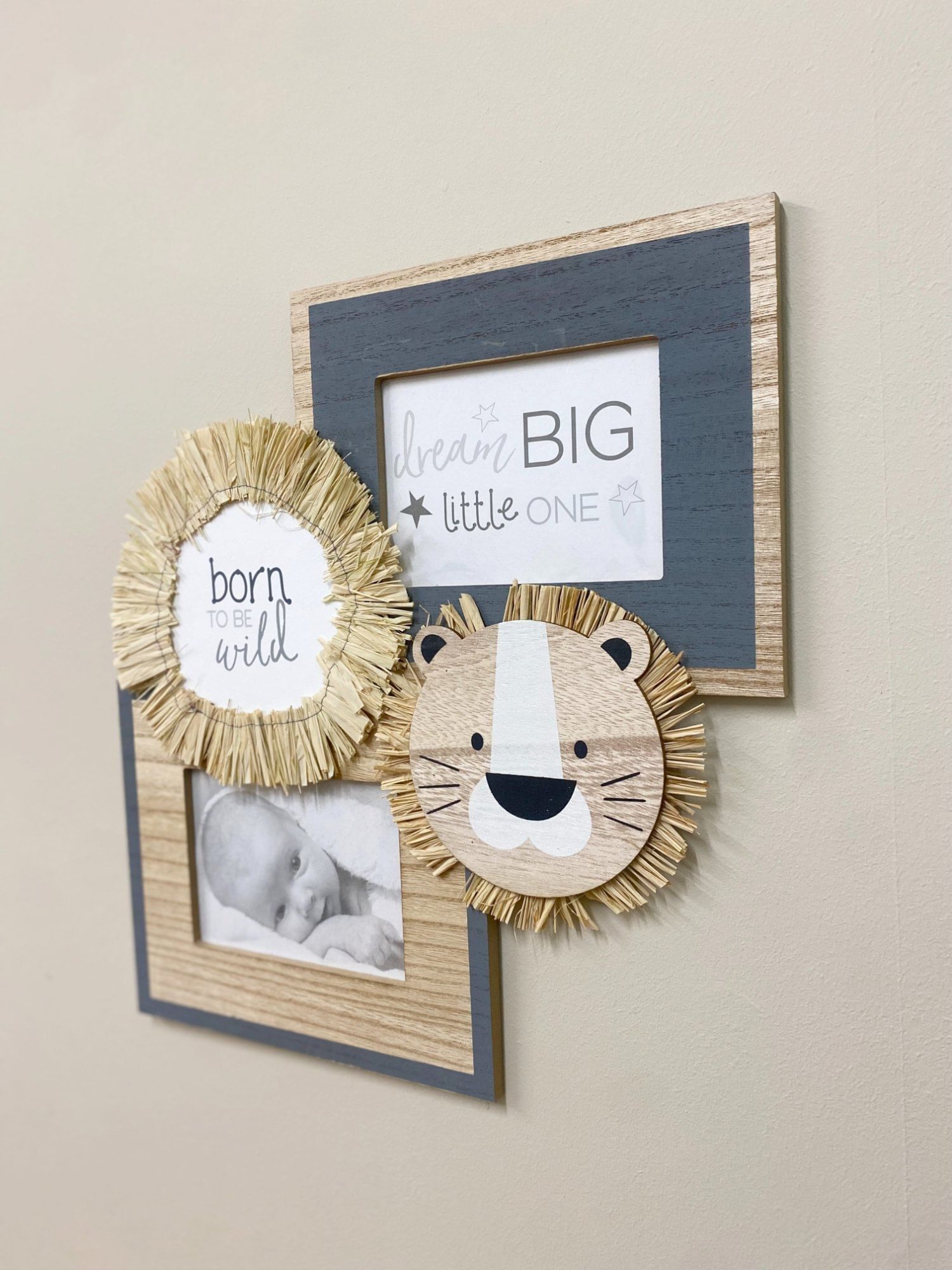 A hanging wooden frame with grey borders mounting 2 photographs along side a lion’s head motif and message ‘born to be wild’. Frame 1 has a grey inner border 4cm with an overall border width of 5cm taking a landscape image 14x10cm. Frame 2 has a wood inner border 4cm and a further grey border 1cm, also takes an 14x10cm photo. A cute lions head with raffia mane rests between the two frames (16cm diameter), along side a raffia edged message plaque stating ‘born to be wild’. This cute piece would add charm to any child’s bedroom or nursery. Measurements: D1 x H39 x W37cm SKU: BB0375