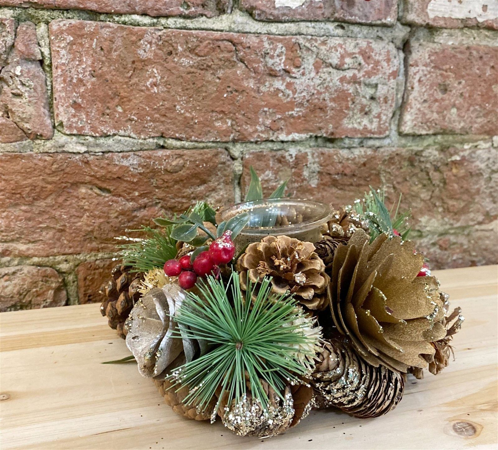 This glitter coated tea light holder is graced by cluster of cones, berries and pine needles, dusted with gold and sliver glitter. A hand crafted decoration that is both radiant and practical. The tea light holder is 4cm diameter at the base and sits with in the decoration of 20cm x 10cm. Overall measurements are: D10 x H20 x W20cm