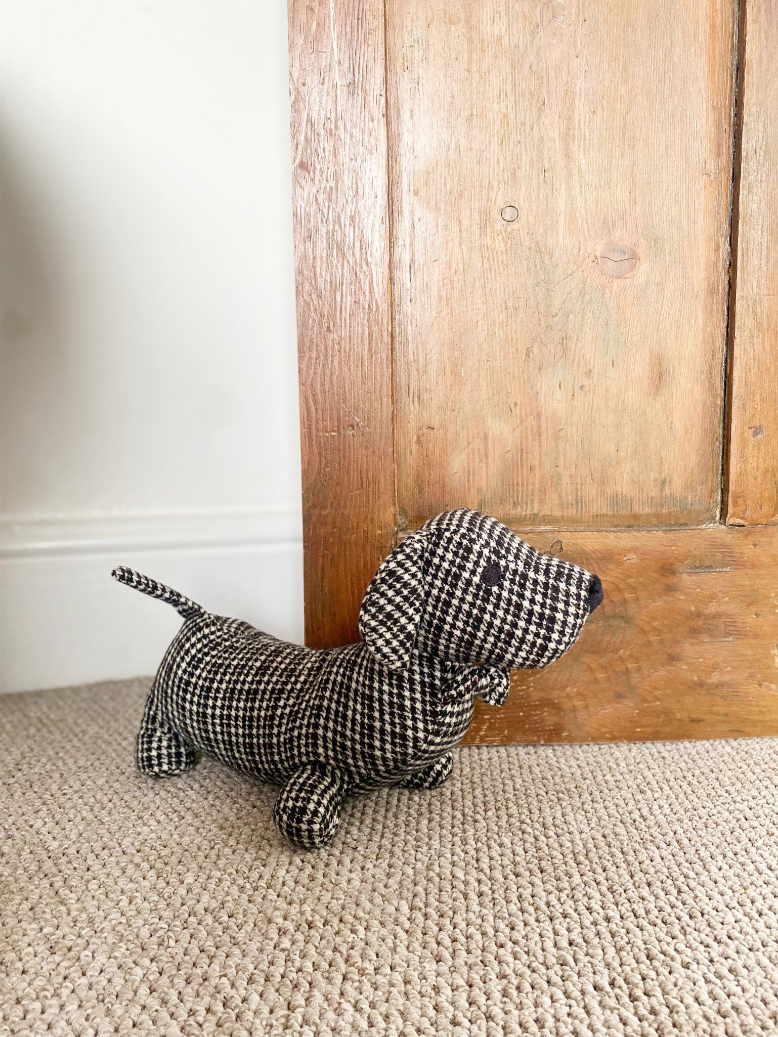 This sausage dog door stop would look at home holding open any door with its practical yet stylish design. The classic herringbone fabric with black colour and natural detail is polyester and can be cleaned with a damp cloth. The item is weighted with sand to keep it in place and keep your doors open. Weighs approximately 1kg. Measurements: D19 x H20 x W32cm