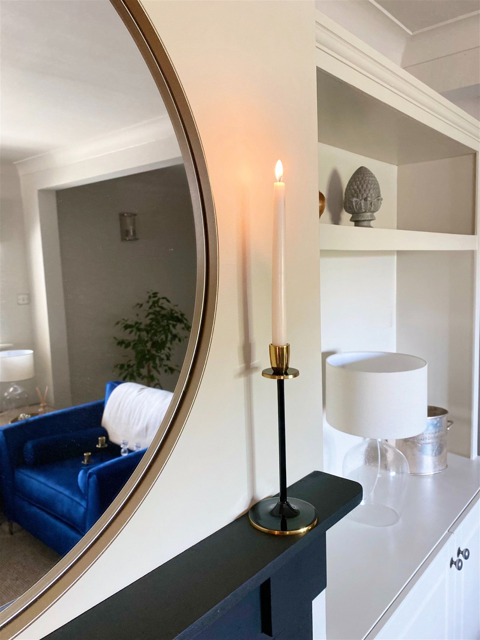 A single retro style, black and gold candle stick holder, with round base. Holds one taper candle. Gold coloured top and trim around base and drip tray, with black stem and base. This candlestick holder is made from 100% Aluminium. Measurements: D10 x H26 x W10cm