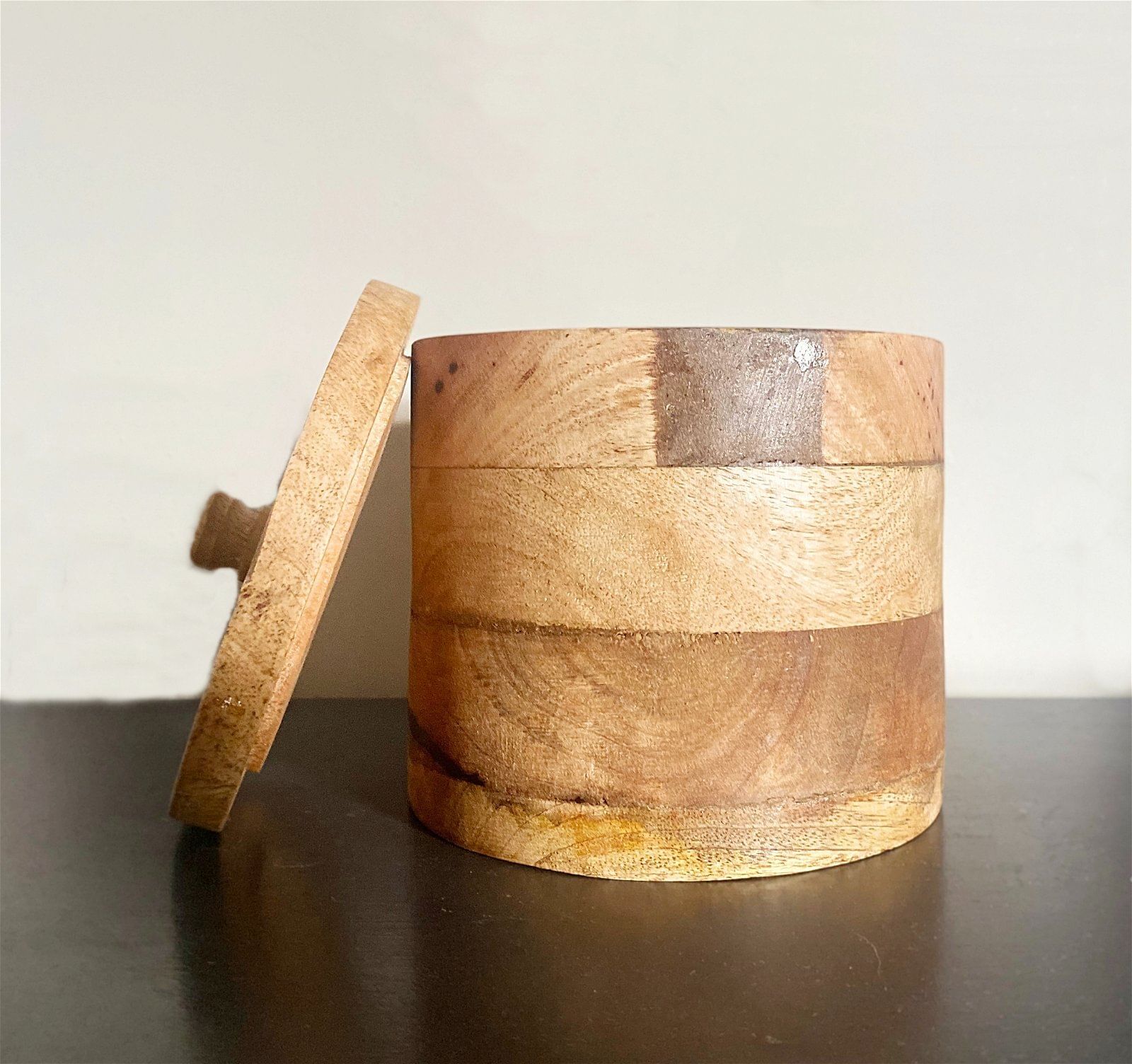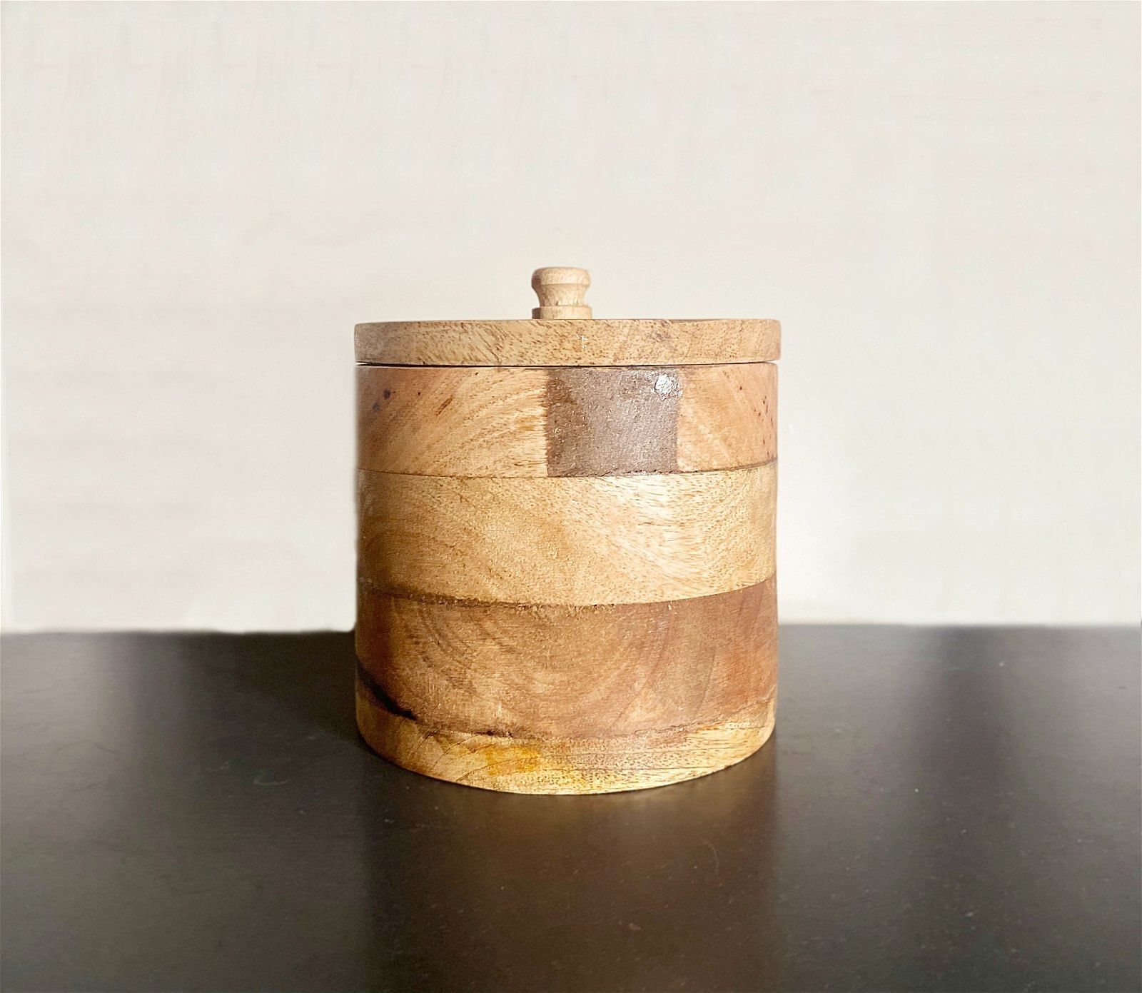A beautifully crafted 100% mango wood circular storage pot, with lid. This cleverly crafted wooden storage pot would fit nicely in a kitchen environment or even elsewhere in the home to store odds and sodds in. Measurements: D15 x H16.5 x W15cm