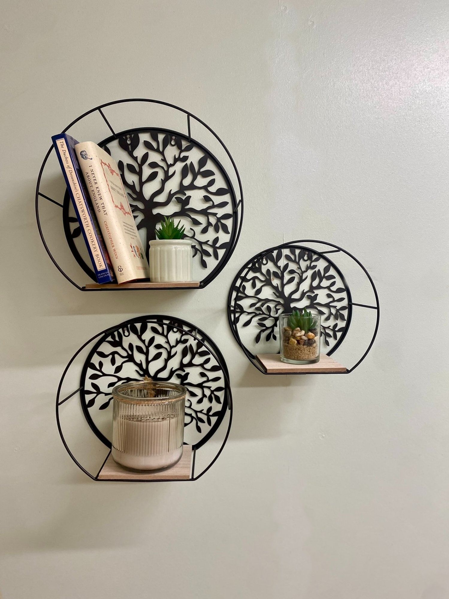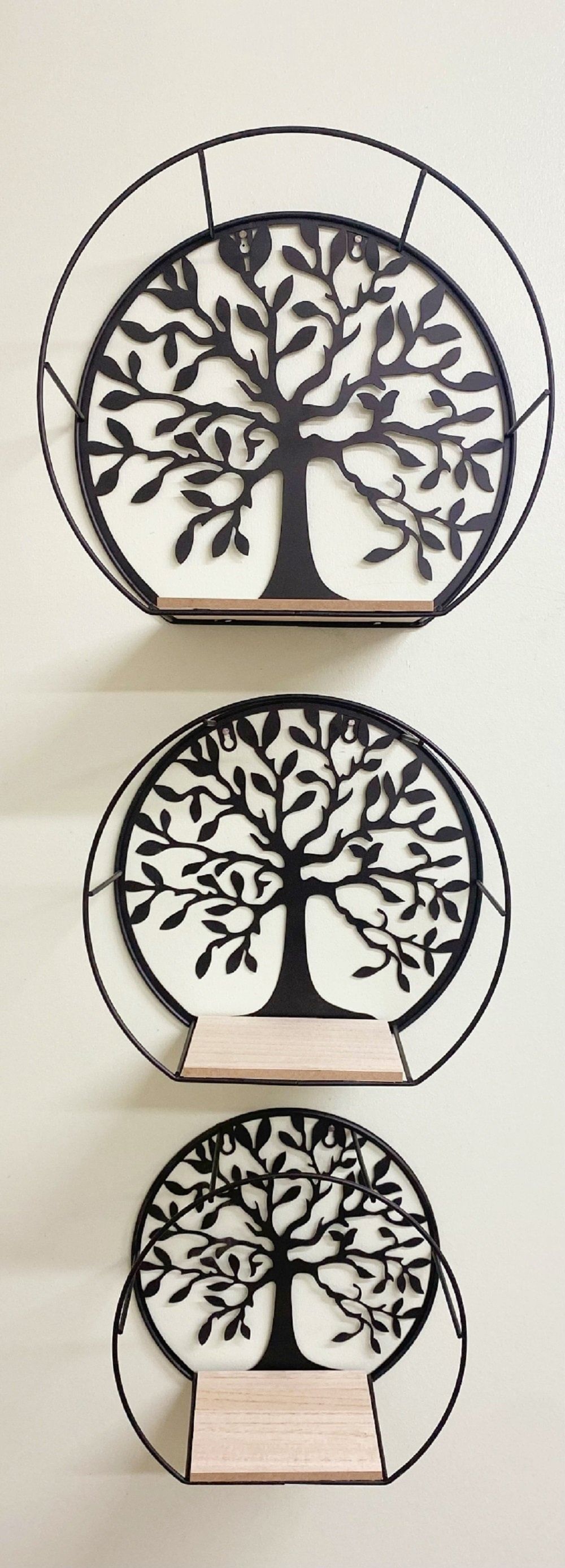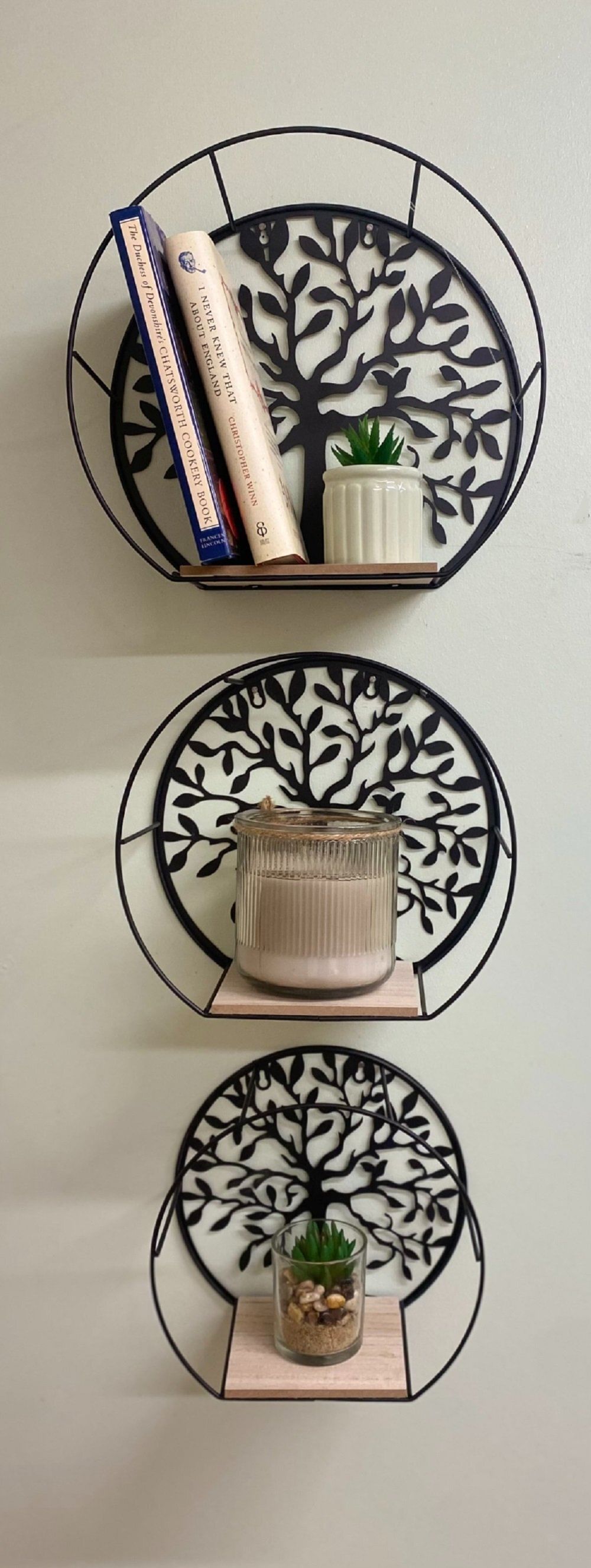 A set of three black wire frames with a shelf and tree of life cut out. These three attractive shelf units are in three sizes of the same design. A black silhouette tree of life is the background for the black wire frame surround, hosting a shelf at the base. The architecture and clean crisp lines are appealing and would certainly compliment any contemporary home. Largest measurements: D13.7 x H28 x W30.5cm Medium measurement: D13 x H24.5 x W13 Small measurement: D12.5 x H21 x W12.5cm