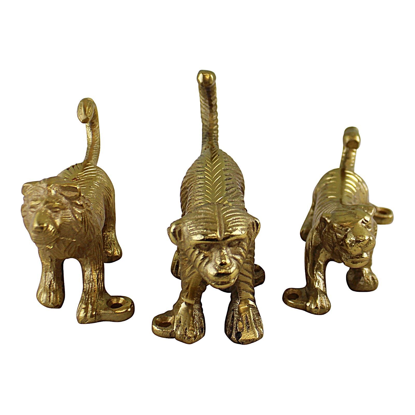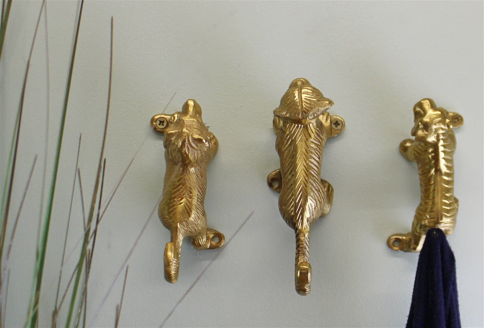 3 small cast metal coat hooks, a lion, tiger & monkey with the tails as hooks. Beautiful, quirky coat hangers to brighten any room. Made of aluminium and finished in a gold colour with 2 fittings to each hook for wall hanging. Measurements: 9 x 14 x 17cm SKU: TJN0238