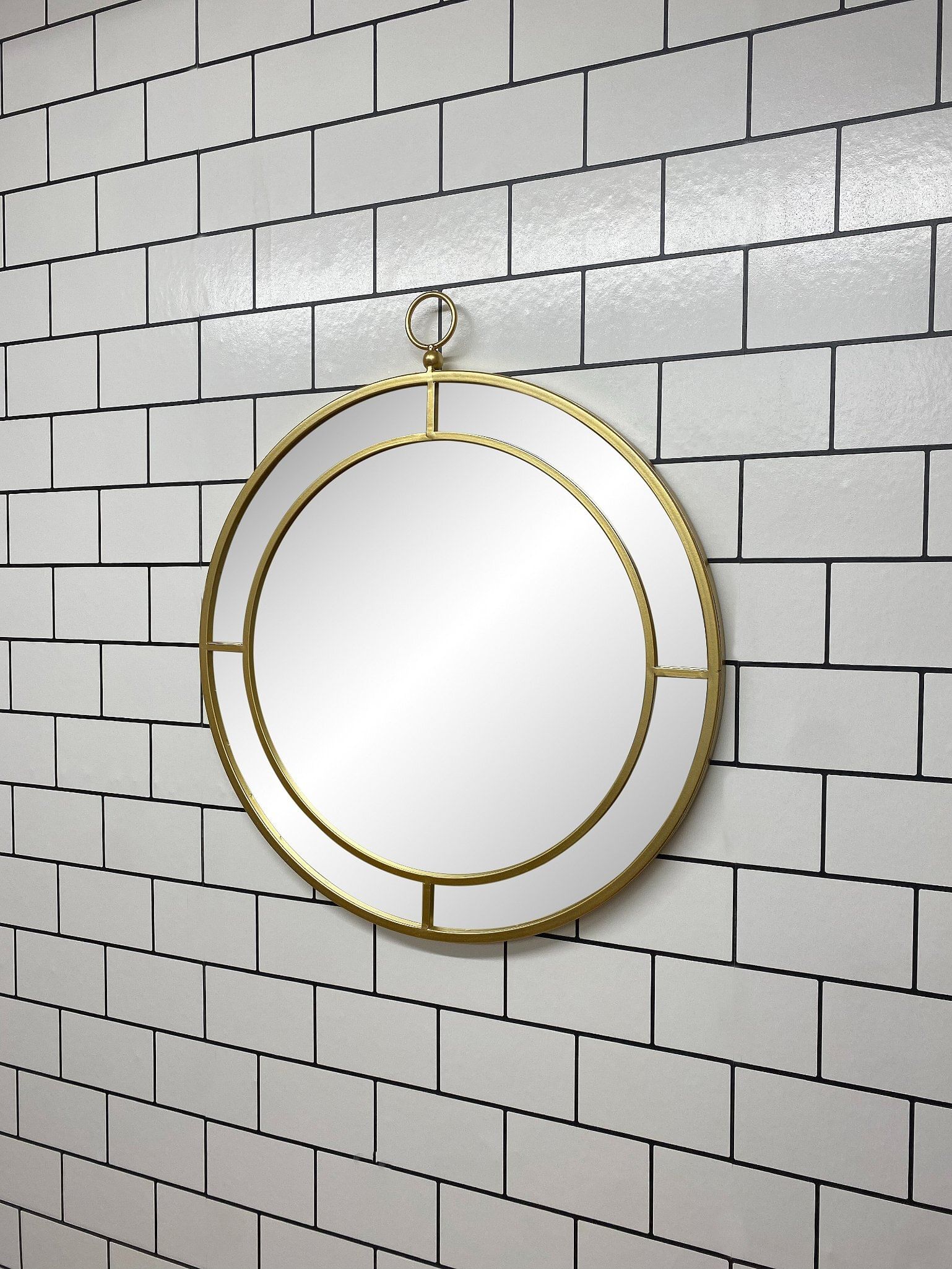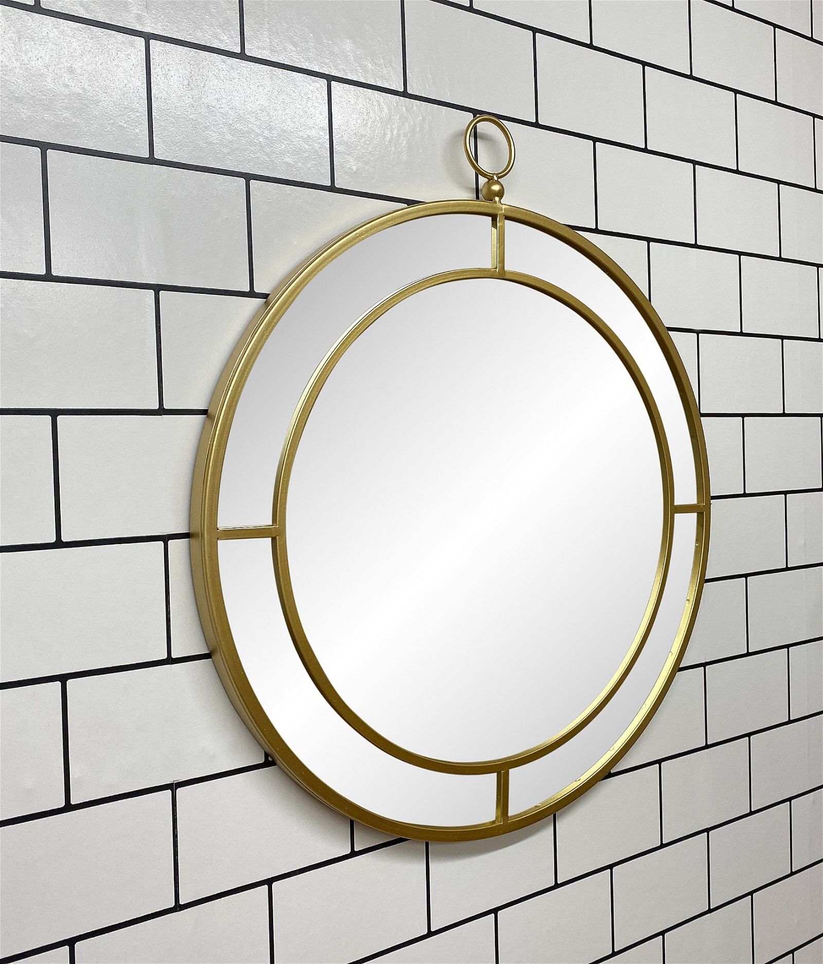 This attractive Sussex design Gold edged mirror is a striking piece with clean elegant lines. It is a circular design with two outer borders and a gold ring at the top for easy hanging. The diameter is 50 cm, the inner border is 5cm from the outer edge and the hanging ring is 5cm diameter. Measurements: D3.5 x H50 x W50cm