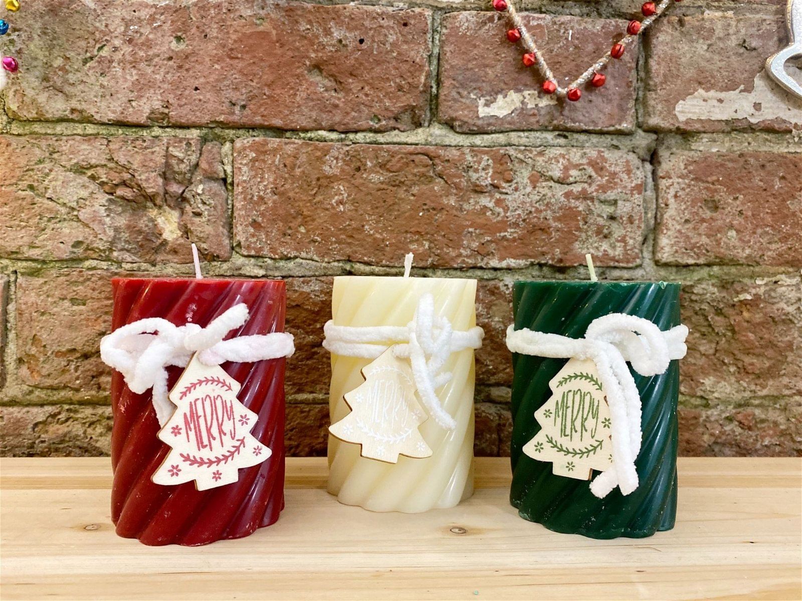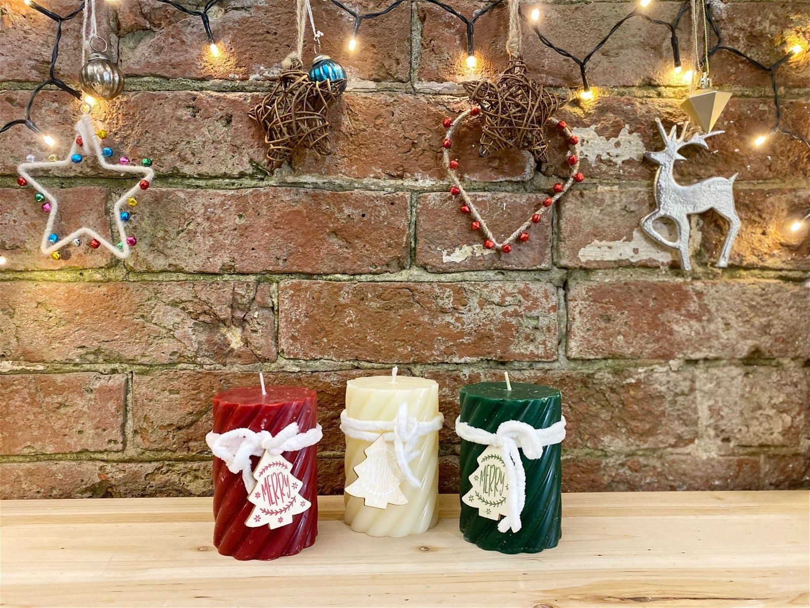 These three festive candles in twisted pillar form are in the traditional colours of red, green and white. They each have a white towelling bow with a carved Christmas tree token with Merry in-scripted upon them. A must have for all Christmas decorations. Each candle measures 7cm diameter and is 10cm tall.