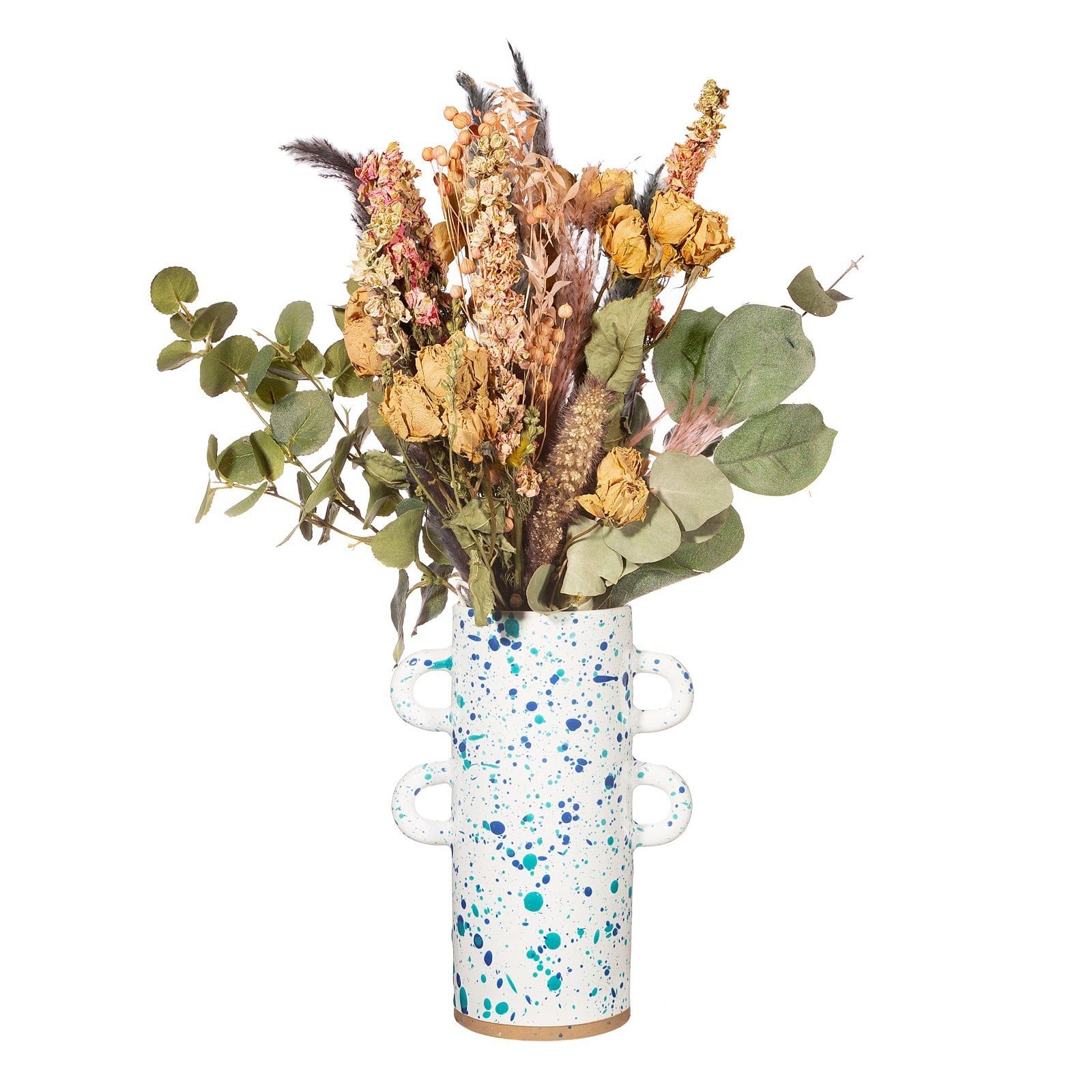 Crafted from stoneware and finished with a splatter design, featuring a colourway of turquoise and blue this large vase is designed for inside the home. Perfect for displaying fresh or dried flowers. This vase has been hand finished. Measurements: D15.5 x H22 x W9.5cm