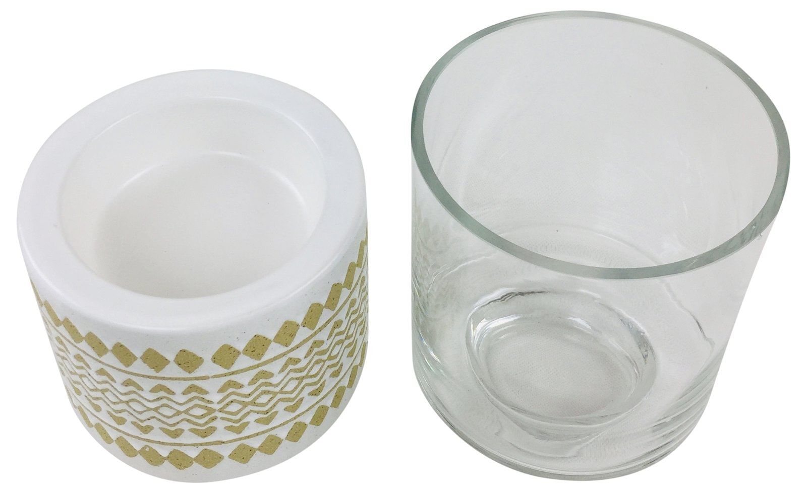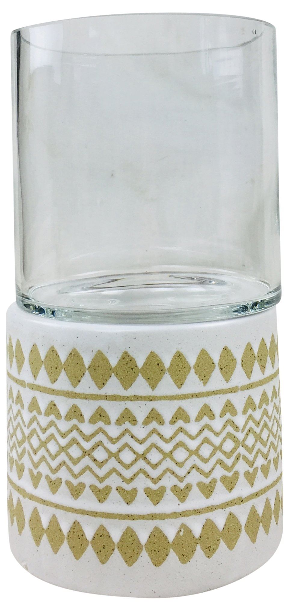 The base has a lovely smooth glazed finish with a rough textured zig zag pattern. The glass top fits into place on the base. There are three pads on the bottom to prevent marking surfaces and movement. Holds a candle with a diameter of 7cm. Material breakdown: 60% stoneware and 40% glass. Measurements: W14cm x D14cm x H26cm. The base diameter is 14cm. The top opening diameter is 13cm. SKU: OR1239